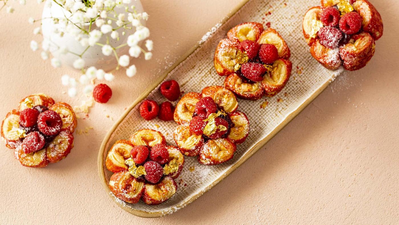 Régi kedvenc némi csavarral és finom töltelékkel. A virágok kifinomult látványt nyújtanak, és sokkal egyszerűbb elkészíteni, mint gondolnánk – hála a friss, sütésre kész leveles tésztának! A töltelékük vaníliás krém, tetejükre málna és málnadzsem kerül. Ne feledjük el a végén megszórni egy kis arannyal! És íme, kész is a virágdesszert!